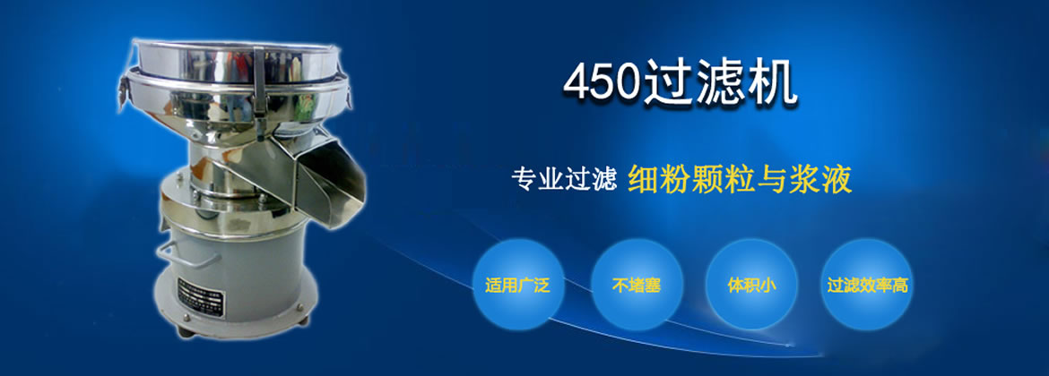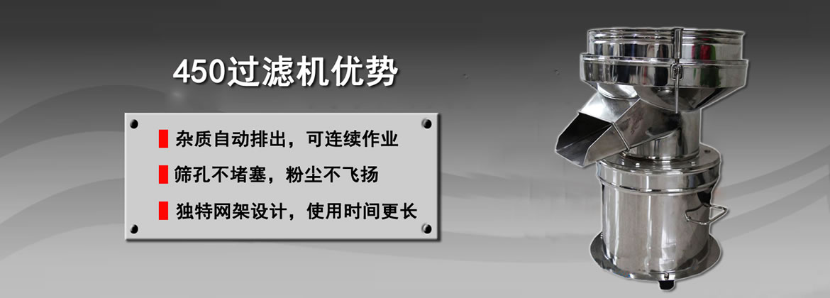 450過濾機是為適用于漿液過濾作業、粉粒分級而專門設計一種高效率、低噪音小型單層篩分機,它集液體過濾、粉粒分級功能為一體。在面粉、油漆過濾行業表現尤為卓越,如325目過濾比重1.1的噴漆料,每小時可達1200公升,30目篩分面粉每小時可處理700公斤。