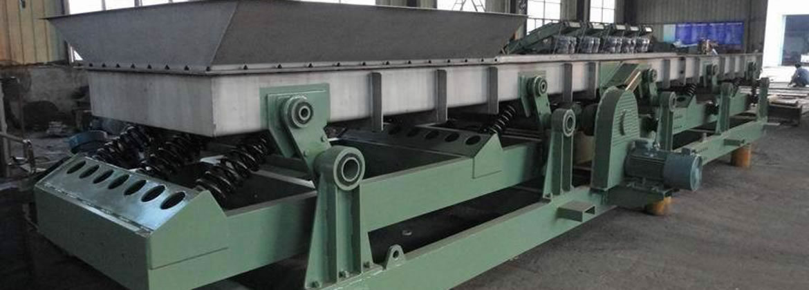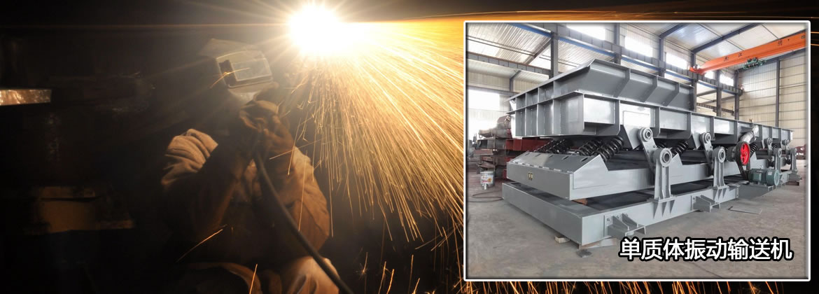 SSL共振式振動(dòng)輸送機(jī)是利用激振器使料槽振動(dòng),從而使槽內(nèi)物料沿一定方向滑行或拋移的連續(xù)輸送機(jī)械。激振器在電機(jī)驅(qū)動(dòng)下產(chǎn)生周期性振動(dòng)力,通過傳動(dòng)機(jī)構(gòu)傳遞到輸送槽,輸送槽在激振源的帶動(dòng)下按激振源相同的振動(dòng)頻率產(chǎn)生周期性線性振動(dòng),同時(shí)振動(dòng)力方向與輸送槽體輸送方向呈一定的拋料角,槽內(nèi)物料在強(qiáng)迫振動(dòng)力的作用下沿槽體輸送面連續(xù)跳躍向前移動(dòng)。除激振機(jī)構(gòu)某些零部件外,相對(duì)轉(zhuǎn)動(dòng)部件很少。物料在振動(dòng)輸送機(jī)中呈現(xiàn)拋射狀態(tài)輸送,對(duì)輸送槽的磨損較小。